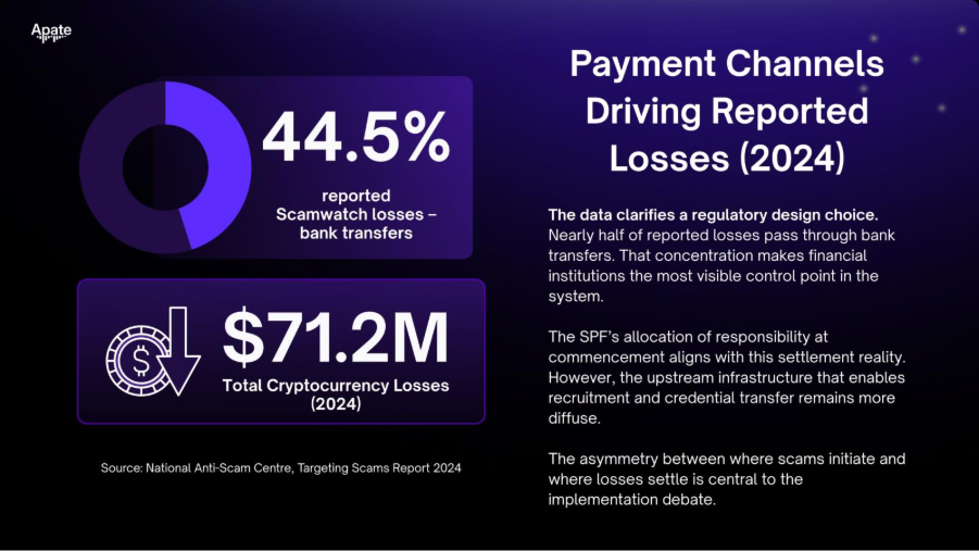 They also highlight how scam losses concentrate within specific financial channels. In 2024, bank transfers accounted for 44.5 percent of reported Scamwatch losses, reflecting the continued reliance of scam operations on bank-based money movement.