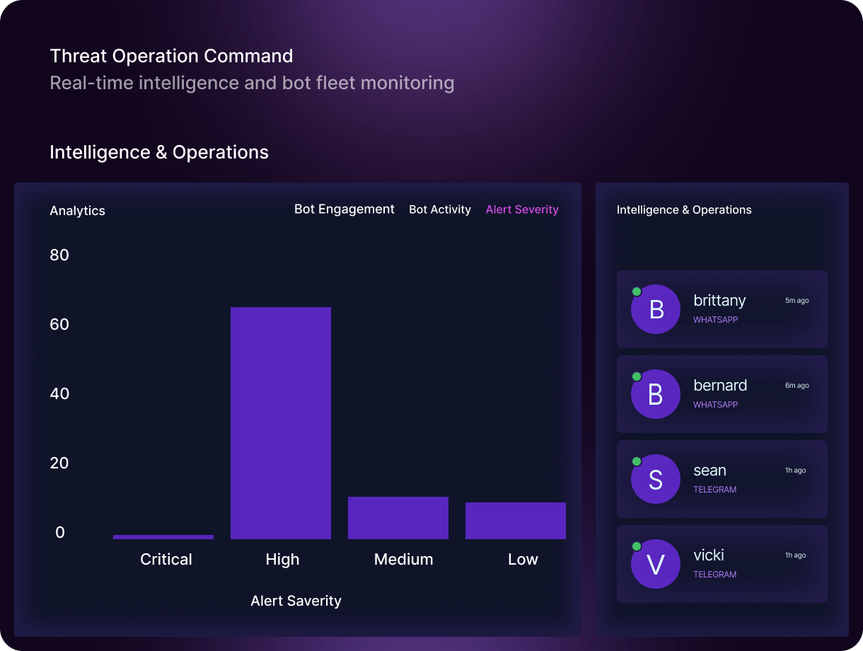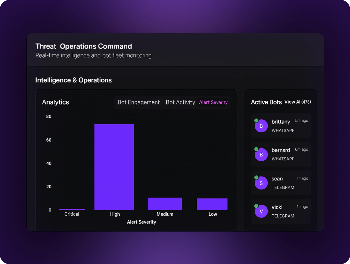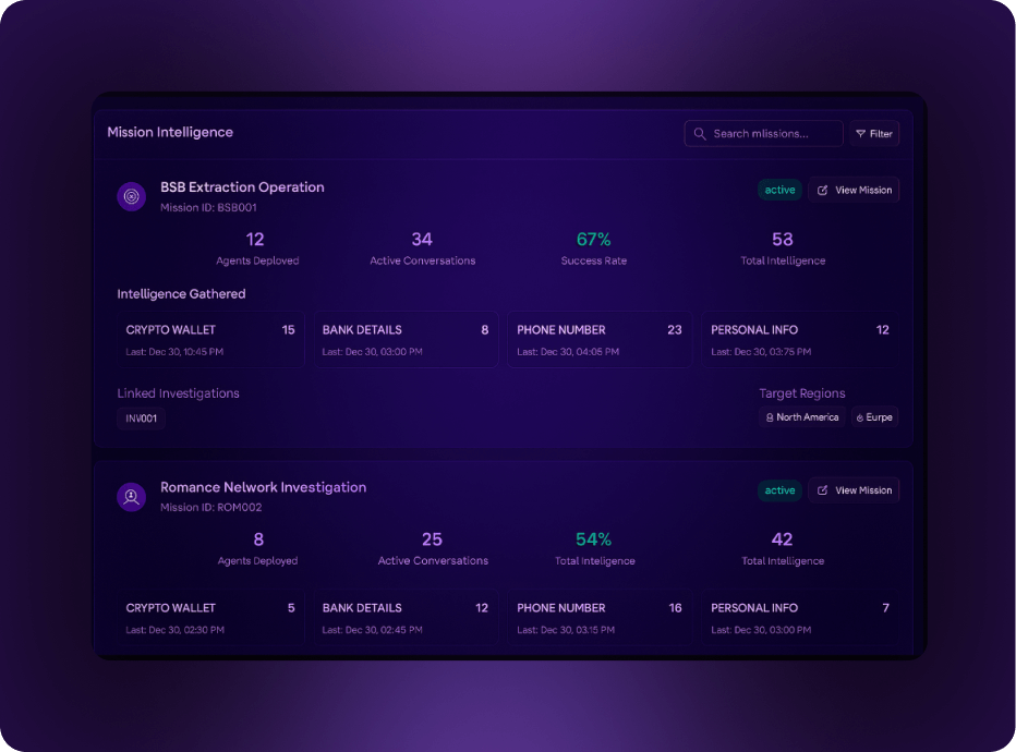 Use advanced AI victim bots to engage scammers at scale and extract high-value intelligence in real time.