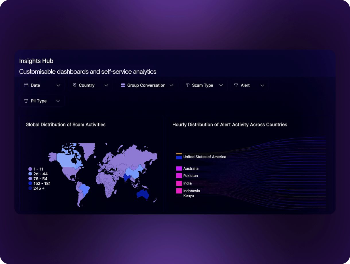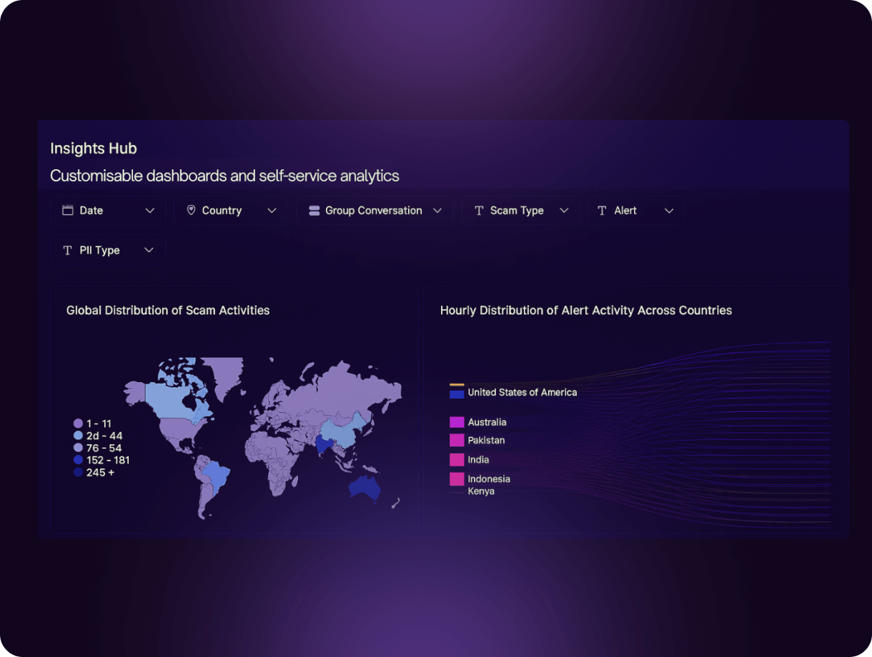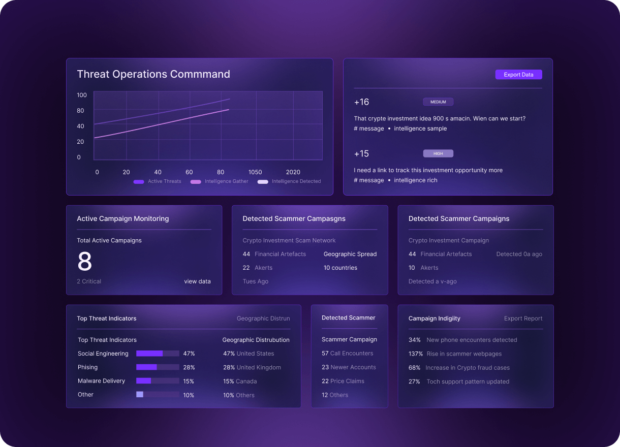 - Equip fraud and cyber teams with detailed intelligence on scam narratives, tactics, and attack surfaces.